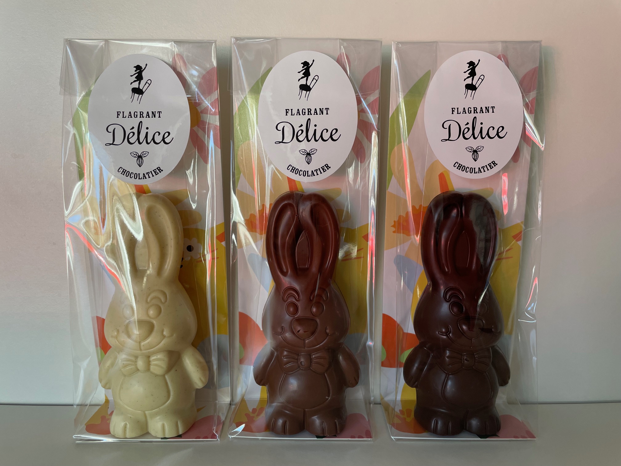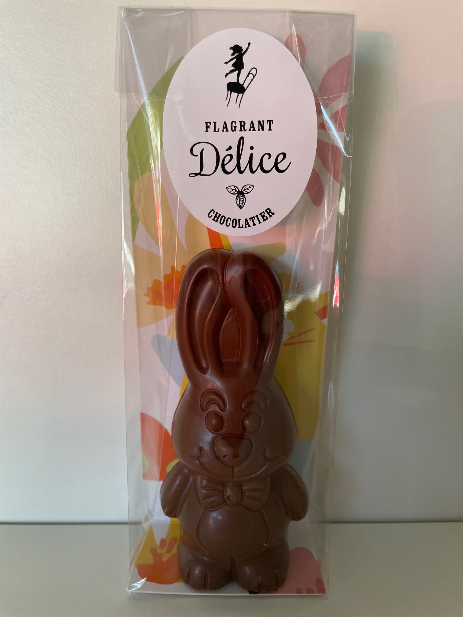 « Fluffy », notre adorable lapin de Pâques, est disponible en sachet individuel, au prix de 4 €. Nous vous proposons ici la version en chocolat au lait du Pérou à 40% de cacao.